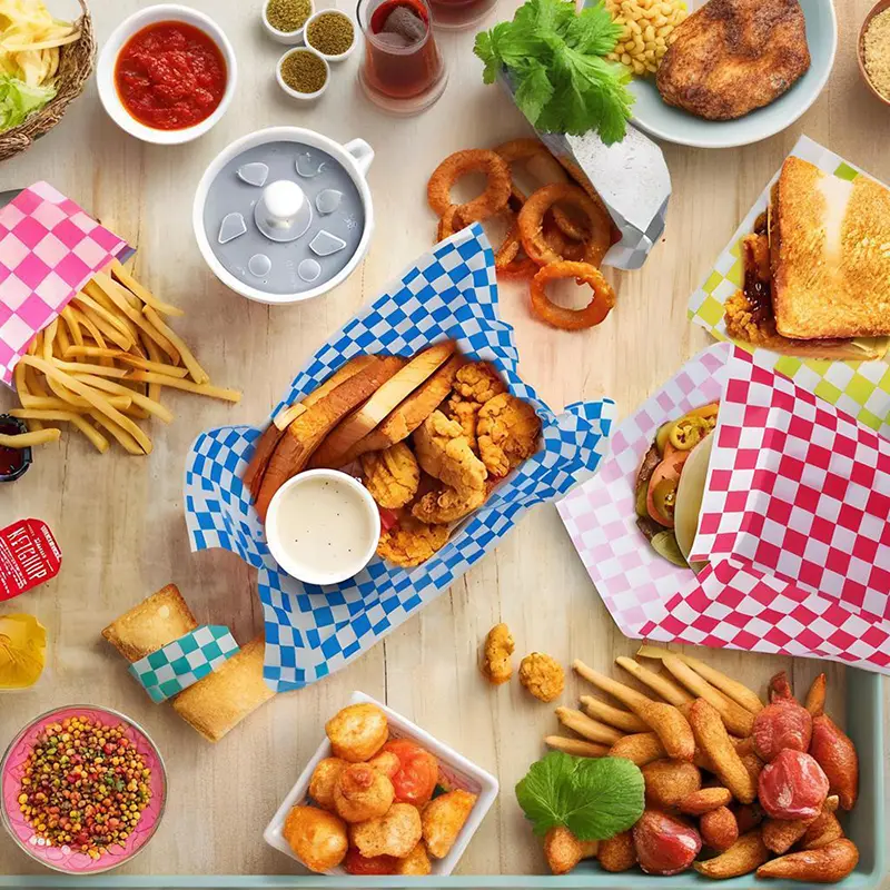 NINGBO POWERR PLASTIC PRODUCTS CO., Ltd oferuje w Chinach kreatywny papier hamburgerowy 38*28 cm w amerykańskim stylu. Jest to profesjonalny papier do pakowania żywności o właściwościach olejoodpornych, wodoodpornych i zapobiegających przywieraniu. Można go używać do pakowania hamburgerów, kanapek, smażonych potraw, pieczonych potraw, owoców, ciastek, wypieków itp. Co więcej, może to być również tymczasowa podkładka pod kubek, pojemnik do przechowywania, materiały ręcznie robione, rekwizyty fotograficzne, rekwizyty do ćwiczeń i tak dalej. Różnorodny tryb życia pozwala w coraz większym stopniu wykorzystywać kreatywność. Jeśli masz jakieś nowe projekty tego produktu, prosimy o współpracę z nami w celu jego rozwoju.