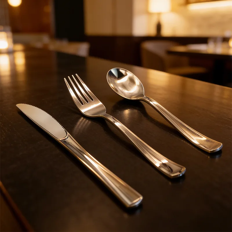 Klasyczne noże imprezowe Widelce Łyżki Plastikowe sztućce to wysokiej jakości jednorazowe plastikowe zastawy stołowe, starannie wykonane przez nas. Jako profesjonalny producent, dostawca i fabryka w Chinach zawsze kładliśmy duży nacisk na jakość produktów i doświadczenie użytkownika. Dzięki temu produktowi na nowo zdefiniowaliśmy styl i wygląd jednorazowych zastaw stołowych. Zestaw ten zawiera trzy rodzaje zastawy stołowej – noże, widelce i łyżki – i nadaje się na różne przyjęcia, bankiety i inne okazje. Może doskonale zastąpić tradycyjną metalową zastawę stołową, zachowując wykwintny wygląd metalowej zastawy, a jednocześnie zapewniając wygodę produktów jednorazowego użytku.