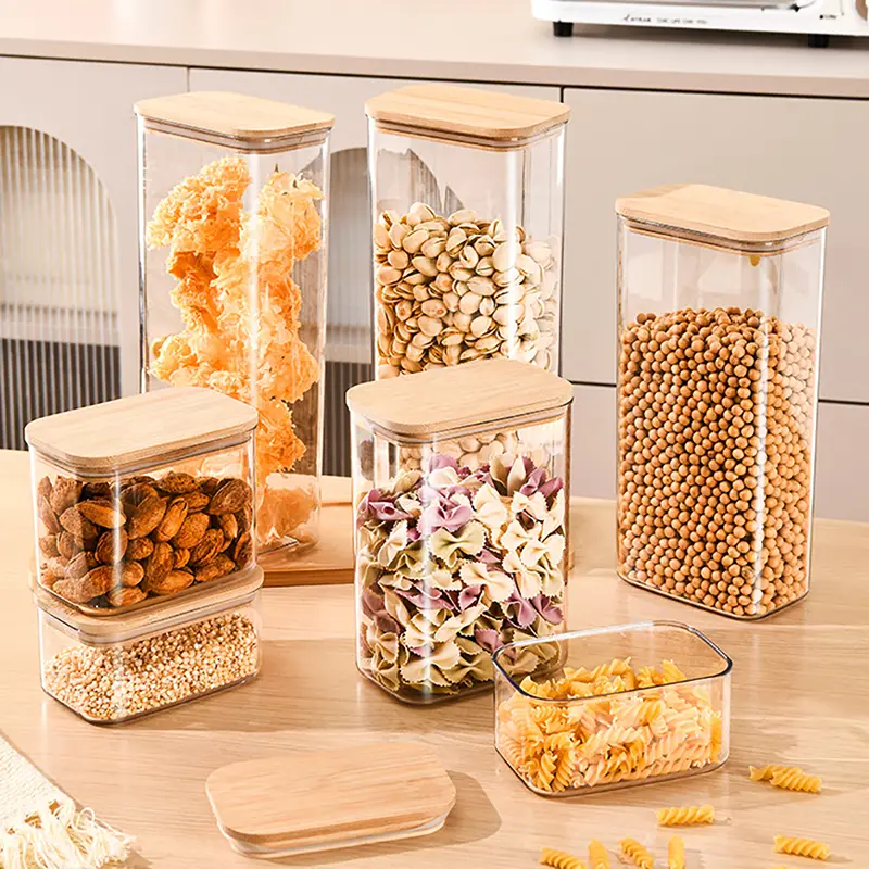Plastikowy słoik do przechowywania z drewnianą pokrywką nadaje się do różnych scenariuszy, takich jak przechowywanie w kuchni w domu, przechowywanie w lodówce w lodówce i przechowywanie suchych towarów na blacie. Można w nim przechowywać różnorodne produkty, w tym zboża, cukierki, przekąski, herbatę, przyprawy i produkty suche. Jest schludnie i uporządkowanie, jest łatwo dostępny, dzięki czemu środowisko domowe jest czystsze i ułatwia życie w kuchni.