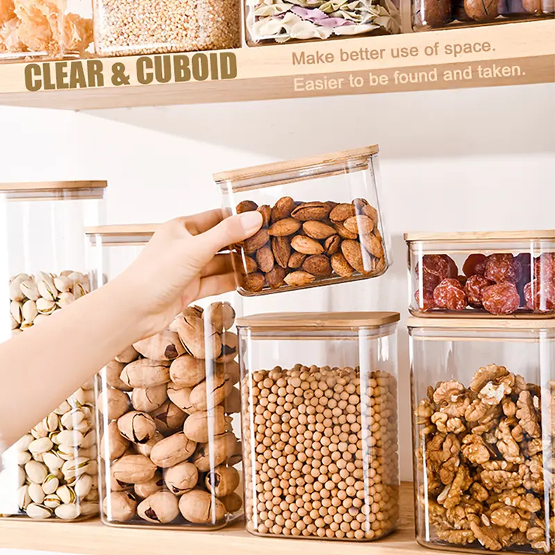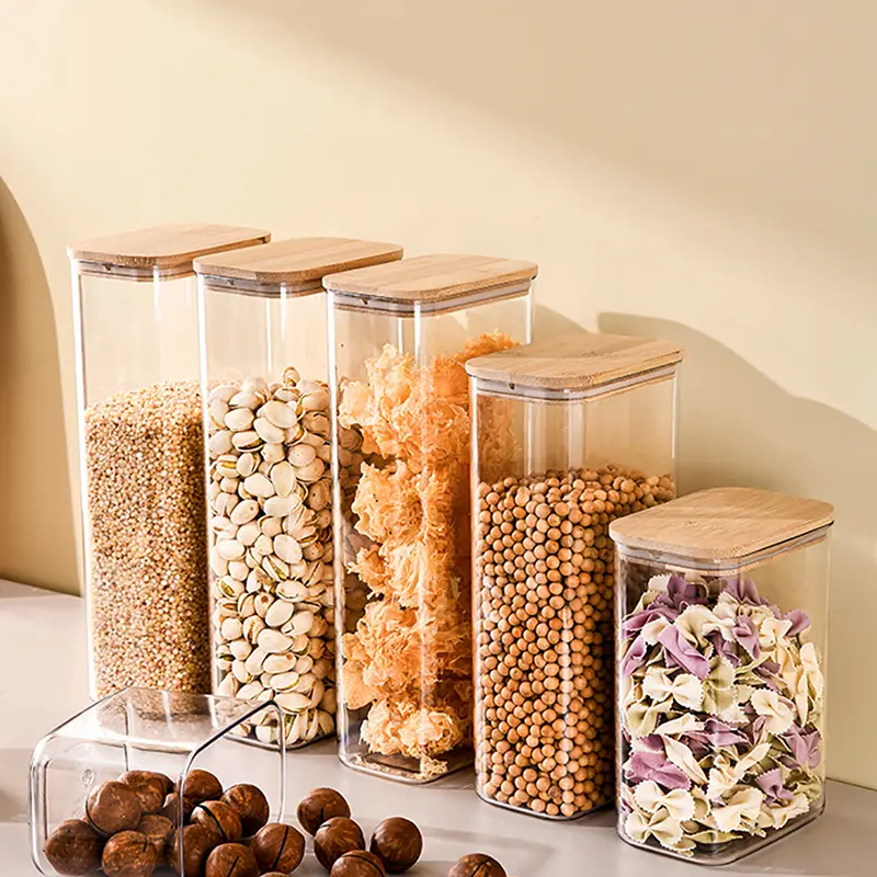 Plastikowy słoik do przechowywania z drewnianą pokrywką: Przezroczystość jest porównywalna do szkła, zapewniając wyraźny i przezroczysty efekt wizualny. Ponadto jest bardziej odporny na upadki i solidniejszy niż szkło. Podczas użytkowania możesz wyraźnie obserwować stan wewnętrzny składników i nie musisz się martwić, że zostaniesz uderzony lub złamany. Jest bardziej uspokajający w codziennym użytkowaniu. Kwadratowe dno i prosta cylindryczna konstrukcja korpusu pozwalają w pełni wykorzystać przestrzeń pionową, dzięki czemu środek ciężkości jest bardziej stabilny i mniej podatny na przewrócenie się. Można go łatwo umieścić w różnych miejscach, takich jak półki szafek, boczne drzwi lodówki, szczeliny w szufladach itp., co zapewnia większe wykorzystanie przestrzeni.